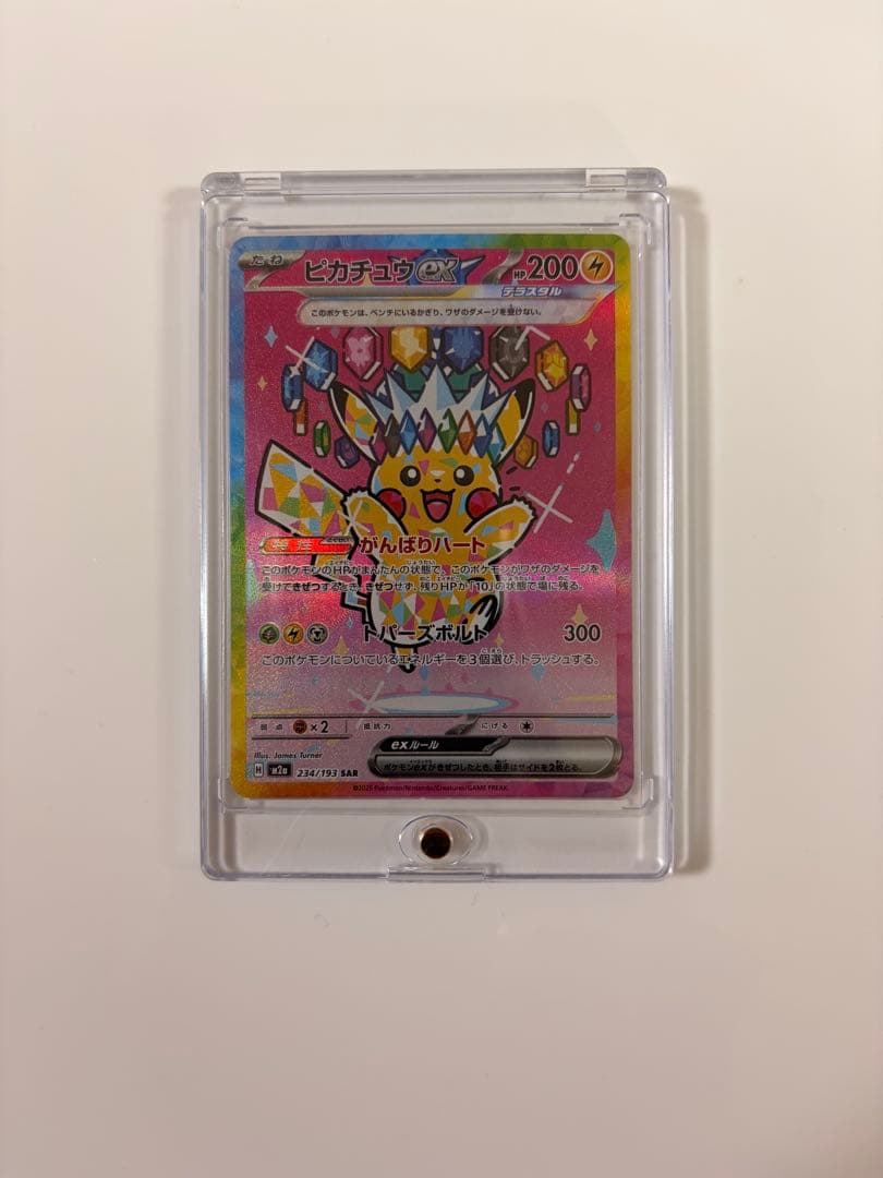 ポケモンカードゲームピカチュウ (001/SV-P) プロモスカーレット・バイオレット 早期購入特典3枚セット【状態について】自身で入手後、すぐにスリーブに入れて暗所にて保管しておりました。• 白欠け、横線、擦れなどは一切見当たらない「極美品」です。• 裁断面も非常に綺麗で、コレクション用としても最適かと思います。• 状態は写真にてご確認ください。(追加の写真が必要な場合はコメントください)【発送方法】• 折れ・濡れ対策を徹底して発送いたします。• 1枚ずつスリーブに入れ、厚紙補強+防水用ジップロックを使用して梱包します。【注意事項】即購入OKです。トラブル防止のため、すり替え防止等の観点から返品は受け付けておりません。状態に自信はありますが、完璧を求める方は写真をご確認の上、納得してからのご購入をお願いします。#ポケカ #ピカチュウ #プロモ #ポケモンカード #極美品 #ScarletViolet #PokemonCards
