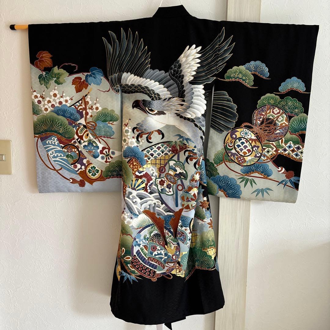 ご覧いただきありがとうございます。七五三3歳用で購入し、2回着用しました。飲食はしておりません。その後自宅保管しておりました。ペットいません。草履は嫌がったのですぐ履き替えたので比較的綺麗だと思います。シミ、汚れは見当たりませんでした。写真5枚目、6枚目に写しているボタンが少しほつれているのと、被布飾りに少しうねりがあります。素人検品です。返品、交換は受け付けておりません。ご了承ください。わからないことあればコメント下さい。購入先の本文より↓■七五三 男の子 3歳 着物フルセット七五三の男の子の3歳のお祝いに。着付けに必要なものはすべて揃っているおしゃれな被布セットです。【必要なものはすべて揃ったフルセット】被布コート・着物・襦袢・半衿(縫い付け済)・伊達衿(縫い付け済)・雪駄・白足袋・腰紐の8点セット。ご家庭でも簡単に着付けができるよう、説明書もお付けいたします。【ポリエステル製でお手入れ簡単】扱いやすいポリエステル素材なので、汚れや食べこぼしを気にせず、安心してご着用いただけます。【肩上げ・腰上げ済】子供の着物はこれからの成長を願って大きめに作られているので、肩上げ・腰上げを施して寸法調整するのが通例です。3歳の標準サイズに合わせて寸法調整済なので、90cm~100cmくらいのお子様であればお直しなしでご着用いただけます。簡単にほどいていただけるので、ご家庭でお子様のサイズに合わせて調整いただくことも可能です。セット内容(1)着物(2)被布コート(3)襦袢(4)半衿(縫い付け済)(5)伊達衿(縫い付け済)(6)腰紐(7)雪駄(8)足袋■サイズ(約/cm)着物身丈(腰上げ後)76着物身丈(腰上げ前)90着物裄丈(肩上げ後)41着物裄丈(肩上げ前)47被布コート身丈50雪駄18足袋15-16■素材◆着物・被布コート・襦袢ポリエステル100%